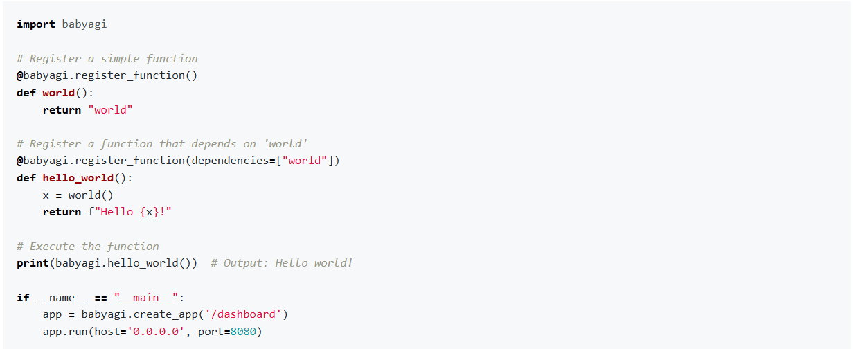 Function Dashboard: Baby AGI comes with a centralized dashboard, offering comprehensive oversight of all the functions within an agent’s architecture. Developers can monitor the real –time execution, visualize dependencies, manage functions lifecycles and observe agent behavior patterns through a unified interface, transforming abstract processes into tangible observations.